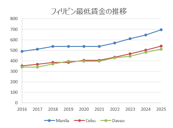 フィリピン主要都市(マニラ、セブ、ダバオ)の最低賃金推移(2016〜2025)